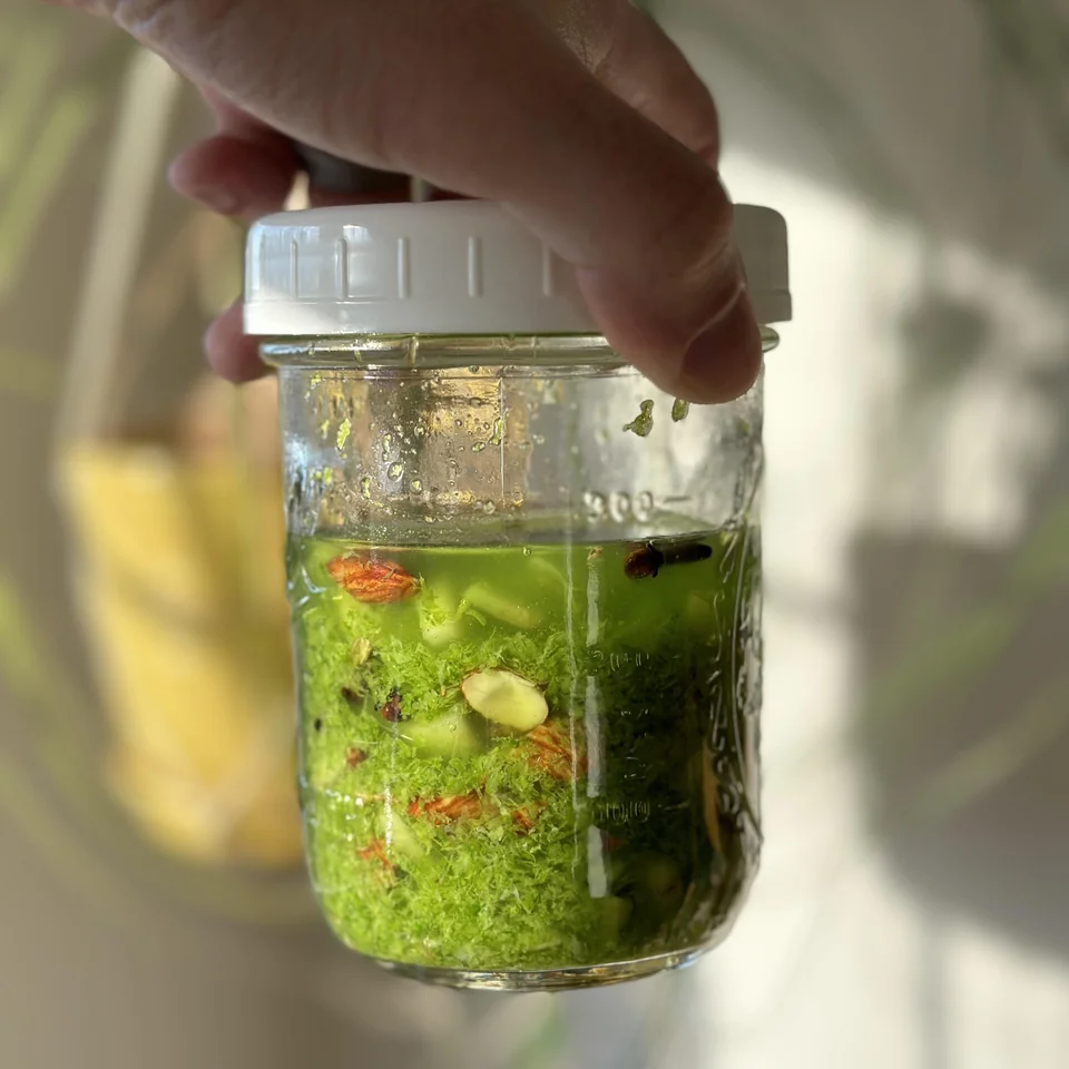 - Add the lime zest, cloves, almonds, ginger and the rum in a pint-sized jar and allow to macerate for 24 hours. Every now and then, take a moment to review your creation. It looks green, strange, almost luminous. Give it a shake. Awesome.