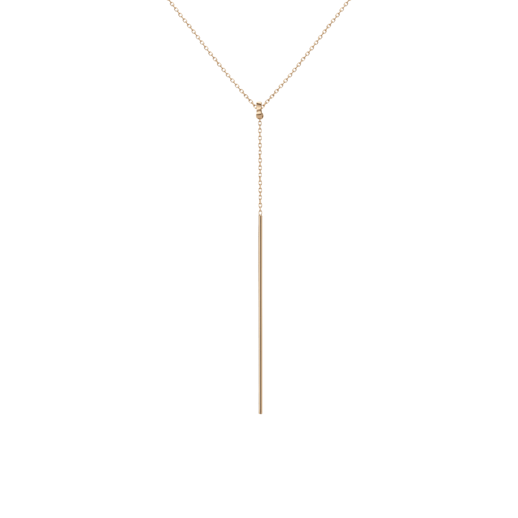 Dainty Lariat Necklace in Yellow, Rose or White GoldPerched along an alluring diamond cut chain, a lariat with long gold wire lays against bare skin. Let its play on light and movement highlight the seductive beauty of gold. Available in 14K or 18K solid gold.