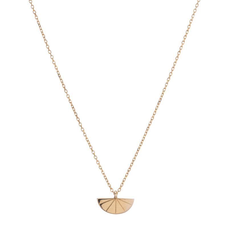 Deco Fan NecklaceAn architectural Art Deco inspired pendant hanging from a delicate chain. The facets catch the eye and we love how open to interpretation this pendant is. Some see a fan, others see an orange slice, anything goes. Details: – approximately 1″ across – 16″ or 18″ cable chain Available in 14K yellow, white and rose gold